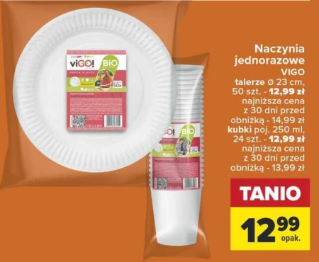 Naczynia jednorazowe VIGO talerze Ø 23 cm, 50 szt. -12,99 zł najniższa cena z 30 dni przed obniżką - 14,99 zł kubki poj. 250 ml, 24 szt. -12,99 zł najniższa cena z 30 dni przed obniżką - 13,99 zł