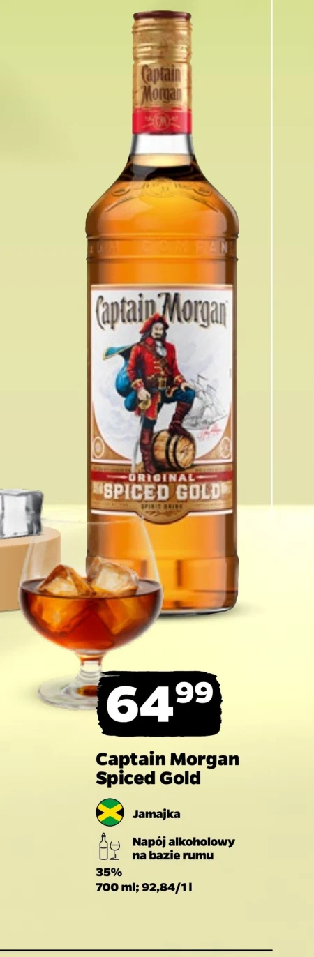 Captain Morgan Spiced Gold Jamajka Napój alkoholowy na bazie rumu 35% 700 ml; 92.84/1l Captain Morgan Spiced Gold to jamajski napój alkoholowy na bazie rumu, idealny do drinków lub picia z lodem. Butelka o pojemności 700 ml dostępna jest w atrakcyjnej cenie 92,84 zł za litr w ofercie Netto. Doskonały wybór dla tych, którzy szukają aromatycznego rumu z nutą przypraw, świetnie sprawdzi się podczas spotkań ze znajomymi. Warto zwrócić uwagę na promocyjną cenę w aktualnej gazetce Netto.