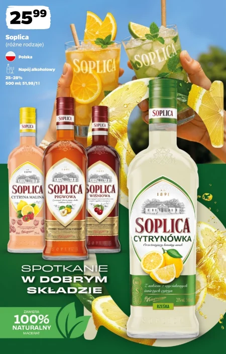 W ofercie Netto dostępna jest Soplica w różnych rodzajach, czyli napój alkoholowy o zawartości alkoholu od 25 do 38%, w butelce 500 ml w cenie 25,99 zł zamiast 51,98 zł. To klasyczny trunek, który sprawdzi się zarówno na rodzinnych spotkaniach, jak i podczas wieczorów w gronie znajomych. Pełka smaku i tradycyjny charakter tego alkoholu docenią miłośnicy polskich trunków. Warto skorzystać z okazji, by zaopatrzyć się w sprawdzony produkt w atrakcyjnej cenie.