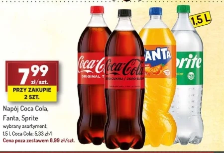 Napój Coca Cola, Fanta, Sprite wybrany asortyment, 1,5 l, Coca Cola; 5,33 zł/l Cena poza zestawem 8,99 zł/szt.