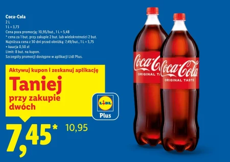 Coca-Cola 2 L 1 L = 3,73 Cena poza promocją: 10,95/but., 1 L = 5,48 * cena za 1 but. przy zakupie 2 but. lub wielokrotności 2 but. Najniższa cena z 30 dni przed obniżką: 7,49/but., 1 L = 3,75 + kaucja 0,50 zł Limit: 8 but. na kupon. Szczegóły promocji dostępne w aplikacji Lidl Plus. Aktywuj kupon i zeskanuj aplikację Taniej przy zakupie dwóch 7,45* 10,95 Coca-Cola w butelce 2L to klasyczny napój, idealny do gaszenia pragnienia lub jako dodatek do ulubionych przekąsek. Aktualną ofertę i możliwość skorzystania z korzystniejszej ceny znajdziesz w najnowszej gazetce Lidl. Warto sprawdzić aplikację Lidl Plus, gdzie dostępne są kupony pozwalające na zakup taniej przy zakupie dwóch butelek. Pamiętaj o doliczeniu kaucji 0,50 zł za butelkę.