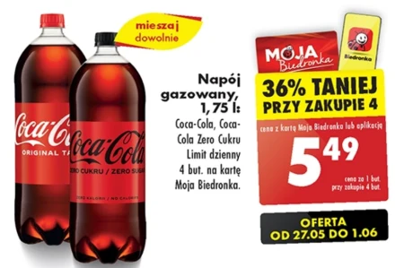 Napój gazowany, 1,75 l: Coca-Cola, Coca- Cola Zero Cukru Limit dzienny 4 but. na kartę Moja Biedronka.