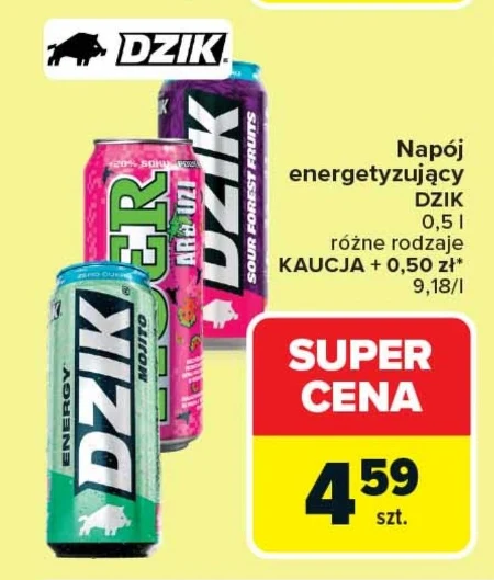 Napój energetyzujący DZIK o pojemności 0,5 l dostępny jest w ofercie Carrefour Market w cenie 4,59 zł. W sklepie znajdziesz różne rodzaje tego napoju, a cena litra wynosi 9,18 zł. Produkt doskonale sprawdzi się, gdy potrzebujesz szybkiego zastrzyku energii w ciągu dnia, podczas pracy lub aktywności fizycznej. Pamiętaj o doliczeniu kaucji w wysokości 0,50 zł. Skorzystaj z tej okazji i zaopatrz się w ulubiony energetyk w atrakcyjnej cenie. Źródło: gazetka Carrefour Market