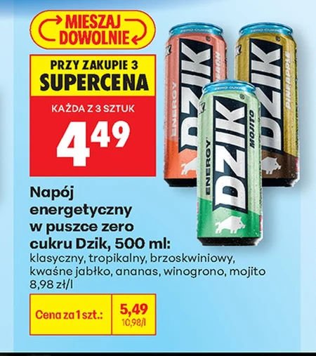 Napój energetyczny w puszce zero cukru Dzik, 500 ml: klasyczny, tropikalny, brzoskwiniowy, kwaśne jabłko, ananas, winogrono, mojito PRZY ZAKUPIE 3 SUPERCENA KAŻDA Z 3 SZTUK 4,49 8,98 zł/l Cena za 1 szt.: 5,49 (16,98 zł/l)