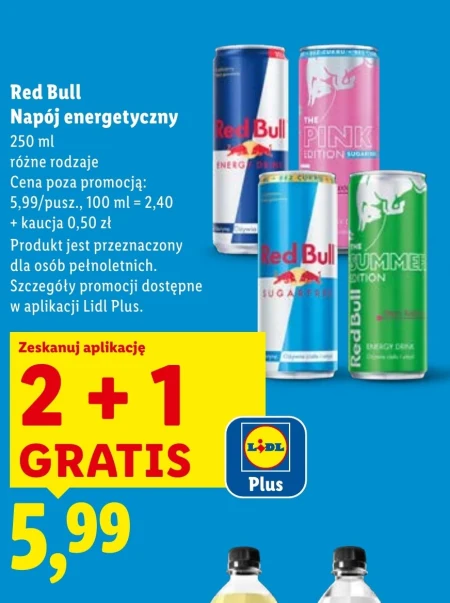 Red Bull Napój energetyczny 250 ml różne rodzaje Cena poza promocją: 5,99/pusz., 100 ml = 2,40 + kaucja 0,50 zł Produkt jest przeznaczony dla osób pełnoletnich. Szczegóły promocji dostępne w aplikacji Lidl Plus.