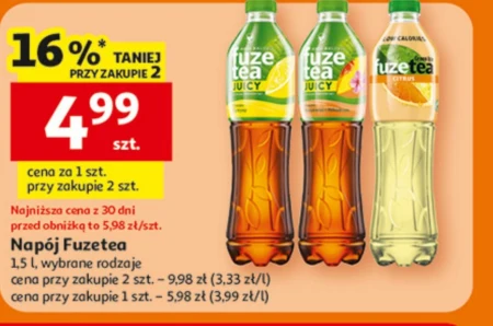Napój Fuzetea 1,5 l, wybrane rodzaje cena przy zakupie 2 szt. - 9,98 zł (3,33 zł/l) cena przy zakupie 1 szt. - 5,98 zł (3,99 zł/l)