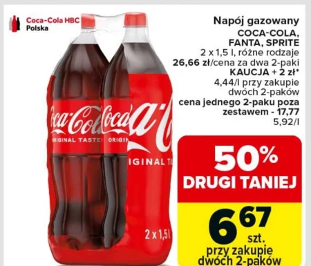 Napój gazowany COCA-COLA, FANTA, SPRITE 2 x 1,5 l, różne rodzaje 26,66 zł/cena za dwa 2-paki KAUCJA + 2 zł* 4,44/l przy zakupie dwóch 2-paków cena jednego 2-paku poza zestawem - 17,77 5,92/1