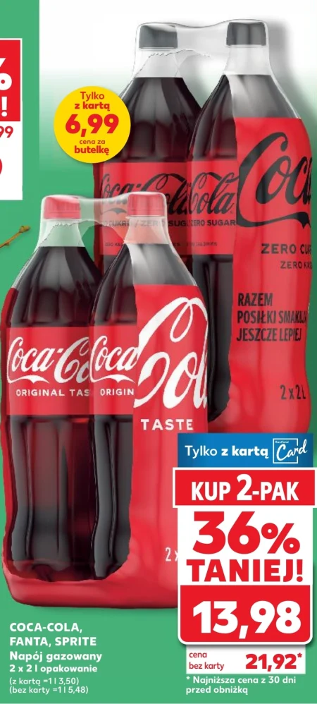 Coca-Cola, Fanta, Sprite w 2-pakowaniu po 2 litry kupisz w Kauflandzie w wyjątkowej cenie. Opakowanie dostępne jest już za 11,50 zł z kartą Card, co oznacza 36% oszczędności w porównaniu do ceny regularnej 21,92 zł. Ten popularny zestaw napojów gazowanych to idealny wybór na spotkania z rodziną i przyjaciółmi, a także na orzeźwienie w upalne dni. Wybierz swój ulubiony smak i ciesz się chwilą!