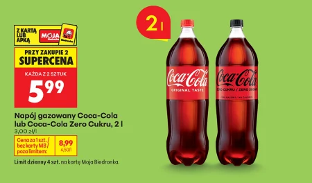 Napój gazowany Coca-Cola lub Coca-Cola Zero Cukru 2 l występuje w ofercie Biedronka w cenie 8,99 zł za dwie sztuki, co daje 4,50 zł za litr przy zakupie dwóch opakowań. Do tej ceny potrzebna jest karta Moja Biedronka lub aplikacja. Poza limitem cena za litr wynosi 3,00 zł. To orzeźwiający napój, idealny do spożycia samodzielnie lub jako dodatek do posiłków. Sprawdzi się podczas spotkań z przyjaciółmi i rodziną, a także w czasie upałów. Limit dzienny zakupu to 4 sztuki na kartę Moja Biedronka, dlatego warto sprawdzić dostępność i wykorzystać wyjątkową okazję. Oferta ważna od 2026-04-29 do 2026-05-06 Źródło: gazetka Biedronka