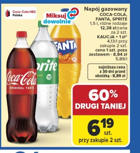 Napój gazowany COCA-COLA, FANTA, SPRITE 1,5 l, różne rodzaje 12,38 zł/cena za 2 szt. KAUCJA + 1 zł* 4,13/l przy zakupie 2 szt. cena 1 szt. poza zestawem - 8,84 zł 5,89/1
