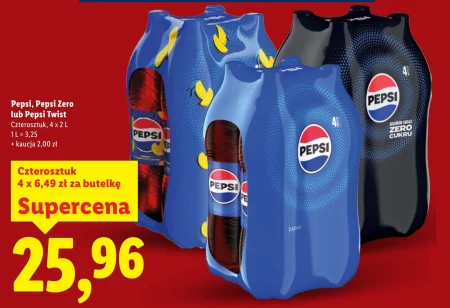 Pepsi, Pepsi Zero lub Pepsi Twist Czterosztuk, 4 x 2 L 1 L = 3,25 + kaucja 2,00 zł Czterosztuk 4 x 6,49 zł za butelkę Supercena 25,96 Duże, 2-litrowe butelki Pepsi, Pepsi Zero lub Pepsi Twist w praktycznym czteropaku to idealne rozwiązanie na rodzinne spotkania lub imprezy. Sprawdź aktualną gazetkę Lidl, aby upewnić się, że ten zestaw jest dostępny w Twoim sklepie i przygotuj się na orzeźwienie. Możesz wybrać swój ulubiony smak Pepsi – klasyczną wersję, bezcukrową Zero lub cytrusowy Twist. Zestaw zawiera cztery butelki, co zapewnia zapas na dłużej.