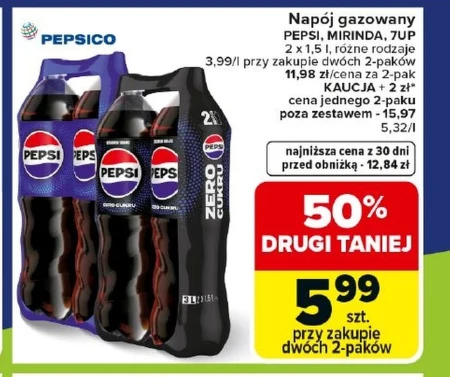 Napój gazowany Pepsi, Mirinda, 7Up 2 x 1,5 l, różne rodzaje dostępny jest w ofercie Carrefour w cenie 5,99 zł za sztukę przy zakupie dwóch 2-paków, co oznacza 50% zniżki. Cena litra przy zakupie dwóch 2-paków to 3,99 zł. Orzeźwiający napój gazowany idealnie gasi pragnienie w upalne dni i doskonale sprawdzi się podczas spotkań z przyjaciółmi lub jako dodatek do posiłku. Skorzystaj z wyjątkowej okazji i zaopatrz się w ulubione smaki w bardzo atrakcyjnej cenie – to świetny sposób na uzupełnienie zapasów na weekend lub imprezę.