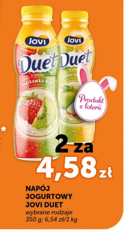 Napój jogurtowy Jovi Duet występuje w ofercie moje sklepy w wybranych rodzajach, w opakowaniu o gramaturze 350 g w cenie 6,54 zł za kilogram. Przy zakupie dwóch opakowań, cena za sztukę spada do 4,58 zł. Ten orzeźwiający napój to doskonała propozycja na śniadanie, drugie śniadanie lub lekką przekąskę w ciągu dnia. Warto wykorzystać tę okazję, by zaopatrzyć się w ulubiony smak.