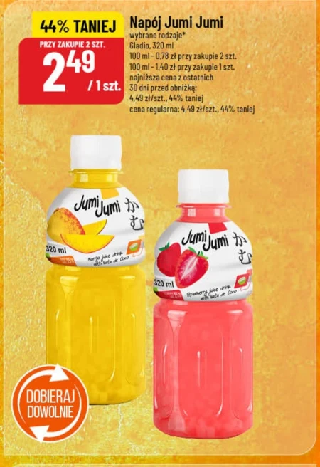 Napój Jumi Jumi wybrane rodzaje* Gladio, 320 ml 100 ml - 0,78 zł przy zakupie 2 szt. 100 ml - 1,40 zł przy zakupie 1 szt. najniższa cena z ostatnich 30 dni przed obniżką: 4,49 zł/szt., 44% taniej cena regularna: 4,49 zł/szt., 44% taniej