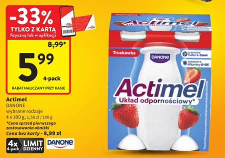 Actimel DANONE wybrane rodzaje 4 × 100 g, 1,50 zł / 100 g *Cena sprzed pierwszego zastosowania obniżki Cena bez karty - 8,99 zł Probiotyczny napój jogurtowy Actimel DANONE to wygodne wsparcie codziennej diety, które pomaga dbać o odporność i prawidłową florę bakteryjną jelit. Dzięki zawartości kultur bakterii i witamin świetnie sprawdzi się jako zdrowa przekąska do pracy, szkoły lub element zbilansowanego śniadania.
