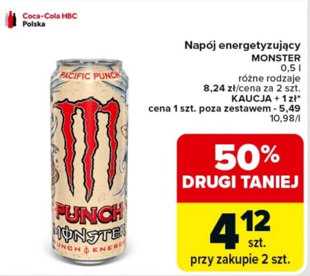 Napój energetyzujący MONSTER 0,5 l różne rodzaje 8,24 zł/cena za 2 szt. KAUCJA + 1 zł* cena 1 szt. poza zestawem - 5,49 10,98/l Energetyzujący napój MONSTER to idealne rozwiązanie dla osób potrzebujących natychmiastowego zastrzyku energii, zwłaszcza w trakcie intensywnego dnia lub treningu. Dzięki różnorodnym smakom, każdy może znaleźć coś dla siebie, a jego właściwości pobudzające wspierają skupienie i wytrzymałość sportową.