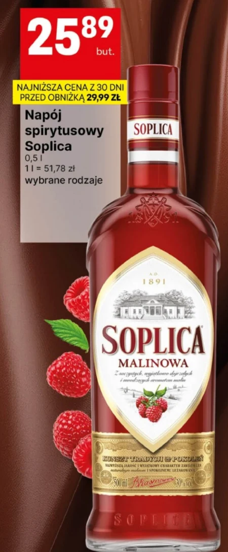 Napój spirytusowy Soplica jest aktualnie dostępny w ofercie Delikatesy Centrum w cenie 25,89 zł za butelkę o pojemności 0,5 l, co daje 51,78 zł za litr. To obniżka z wcześniejszej ceny 29,99 zł, a oferta jest najniższa w ciągu ostatnich 30 dni. Produkt ten to klasyczny alkohol, idealny na rodzinne uroczystości lub spotkania z przyjaciółmi. Wybrane rodzaje dostępne są w Delikatesy Centrum, co daje możliwość wyboru ulubionego smaku w atrakcyjnej cenie. Warto skorzystać z tej wyjątkowej okazji i zaopatrzyć się w sprawdzony trunek. Oferta ważna od 2026-04-02 do 2026-04-15 Źródło: gazetka Delikatesy Centrum