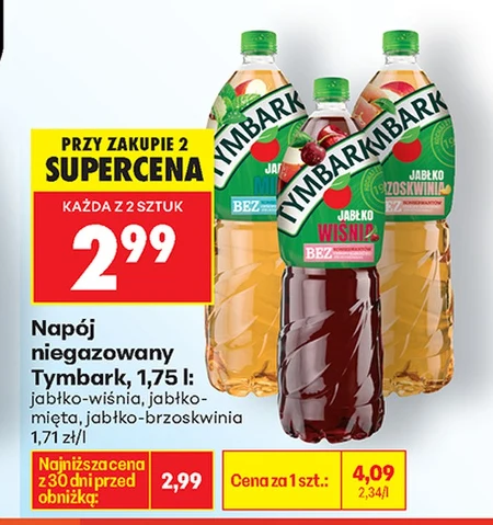 Napój niegazowany Tymbark, 1,75 l: jabłko-wiśnia, jabłko- mięta, jabłko-brzoskwinia 1,71 zł/l