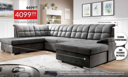 NAROŻNIK NIXON LUX Wersja prawa/lewa. Wymiary 330/164-212/86-102 powierzchnia spania 117/250. Sprężyna falista. Dwa pojemniki na pościel Inne kolory i tkaniny dostępne na zamówienie. Mebel wypoczynkowy z funkcją spania.. Najniższa cena towaru w okresie 30 dni przed wprowadzeniem obniżki: 4049,99