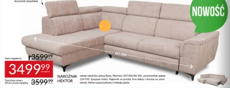 NAROŻNIK HEKTOR wersja narożnika prawa/lewa. Wymiary 267/202/86-101, powierzchnia sparia 124/195. Sprężyna falista. Pojemnik na pościel. Inne kolory i tkaniny na zamó- wienie. Mebel wypoczynkowy z funkcja spania.