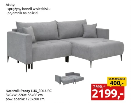 Narożnik Ponty LUX_2DL.URC SxGxW: 226x155x88 cm pow. spania: 123×200 cm Atuty: - sprężyny bonell w siedzisku - pojemnik na pościel