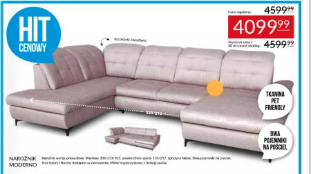 NAROŻNIK MODERNO Narożnik wersja prawa/lewa. Wymiary 330/213/105, powierzchnia spania 126/257. Sprężyna falista. Dwa pojemniki na pościel. Inne kolory i tkaniny dostępne na zamówienie. Mebel wypoczynkowy z funkcją spania.