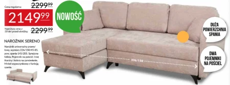 NAROŻNIK SERENO Narożnik uniwersalny prawy/ lowy: wymiary 226/150/45-85 pow. spania 145/205. Sprężyna falista. Pojemnik na pościel, Inne tkaniny i kolory na zamówienie. Mebel wypoczynkowy z funkcją spania.