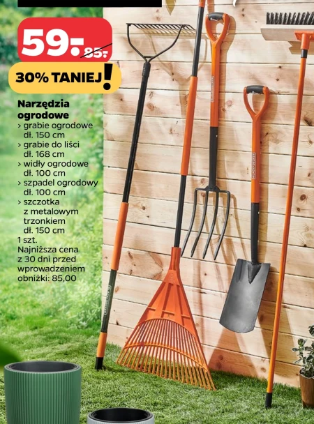 Narzędzia ogrodowe: grabie ogrodowe dł. 150 cm; grabie do liści dł. 168 cm; widły ogrodowe dł. 100 cm; szpadel ogrodowy dł. 100 cm; szczotka z metalowym trzonkiem dł. 150 cm. 1 szt.