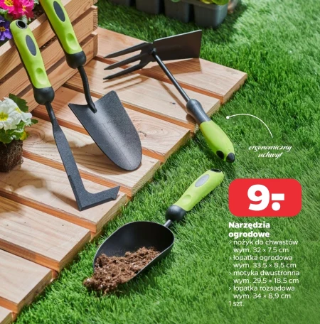 Narzędzia ogrodowe: nożyk do chwastów wym. 32 x 7,5 cm; łopatka ogrodowa wym. 33,5 x 8,5 cm; > motyka dwustronna wym. 29,5 x 18,5 cm; › łopatka rozsadowa wym. 34 x 8,9 cm 1 szt.