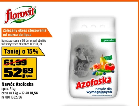 Nawóz Azofoska opak. 5 kg cena za 1 kg = 12,40 10,54 Zalecany okres stosowania od marca do lipca Najniższa cena z 30 dni przed obniżką we wszystkich sklepach OBI: 61,99 Taniej o 15% 52,69 opak. nr OBI 1632736 Azofoska to uniwersalny nawóz mineralny, idealny do stosowania w okresie od marca do lipca. Aktualnie dostępny w OBI w promocyjnej cenie 10,54 zł za kilogram w opakowaniu 5 kg, co stanowi obniżkę o 15% względem ceny z ostatnich 30 dni. To doskonała okazja, by przygotować ogród do sezonu, korzystając z sprawdzonej jakości produktów dostępnych w OBI. Numer produktu w OBI to 1632736.