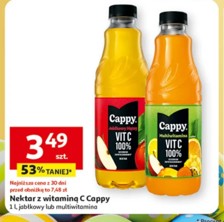 Nektar z witaminą C Cappy 1 l, jabłkowy lub multiwitamina Pyszny nektar Cappy z witaminą C to doskonały sposób na wzmocnienie odporności, szczególnie w sezonie jesienno-zimowym, dostarczając jednocześnie naturalnej słodyczy i orzeźwienia. Idealnie sprawdzi się jako dodatek do śniadania, składnik koktajli witaminowych lub orzeźwiający napój w ciągu dnia, dbając o codzienne dawki witamin i minerałów. Wybierając smak jabłkowy lub multiwitamina, zyskujesz zdrową alternatywę dla słodkich napojów, bogatą w cenne składniki odżywcze dla całej rodziny.