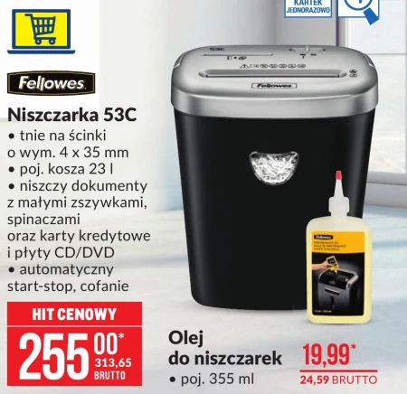 Niszczarka dokumentów 53C. Tnie na ścinki o wymiarach 4 x 35 mm. Pojemność kosza 23 litry. Niszczy dokumenty z małymi zszywkami, spinaczami oraz karty kredytowe i płyty CD/DVD. Automatyczny start-stop, cofanie. Cena netto - 255 zł.