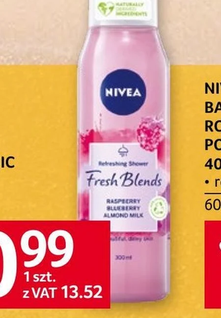 Poznaj nasz odświeżający żel pod prysznic NIVEA® Fresh Blends, który stworzyliśmy nie tylko z miłości do Twojej skóry, ale również z troski o naszą planetę. Formuła skomponowana została ze składników pochodzenia naturalnego* i jest w 98% biodegradowalna**. Formuła różowego wariantu to olśniewająca kompozycja z dodatkiem mleka migdałowego, która łączy w sobie owocowe aromaty malin i borówek amerykańskich, podkreślone nutą zielonego rabarbaru i bergamotki. Ten wyborny, kobiecy zapach zapewnia radosne chwile pod prysznicem i świeży początek wspaniałego dnia lub przyjemne odświeżenie wieczorem. Nasza formuła dba o Twoją skórę, zachowując równowagę jej mikrobiomu. Żel nie zawiera mikroplastików - zgodnie z definicja UNEP. *zawiera 90% składników pochodzenia naturalnego zachowujących ponad 50% swojej struktury molekularnej (stanu naturalnego) po przetworzeniu, włącznie z wodą. **zgodnie z OECD 301/302 lub zbliżonymi metodami