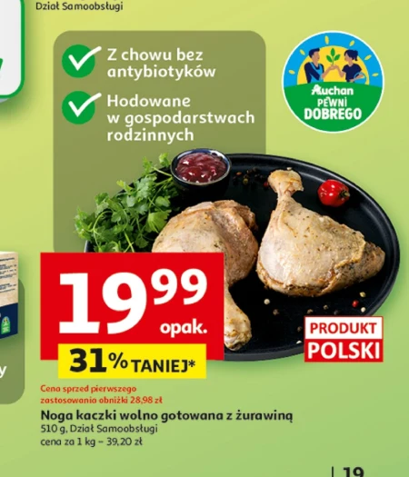 Noga kaczki wolno gotowana z żurawiną jest dostępna w ofercie Auchan w cenie 19,99 zł za opakowanie o wadze 310 g, co oznacza 31% taniej w porównaniu do ceny sprzed obniżki, wynoszącej 28,98 zł. Produkt ten to gotowe danie, idealne jako smaczny i sycący posiłek, szczególnie cenione za połączenie aromatycznego mięsa kaczki z wyrazistym smakiem żurawiny. Przygotowanie tego dania zajmuje minimalnie czasu, co czyni go doskonałym wyborem dla osób ceniących wygodę bez rezygnacji z jakości. Aktualna cena za kilogram produktu to 39,20 zł, co w połączeniu z obniżką stanowi wyjątkową okazję, by spróbować tego wyjątkowego specjału.