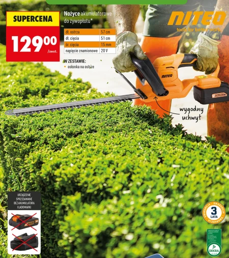 Nożyce akumulatorowe do żywopłotu występują w ofercie Biedronka w cenie 129,00 zł za zestaw. To narzędzie przeznaczone jest do precyzyjnego i efektywnego cięcia żywopłotów, zapewniając schludny wygląd ogrodu. Posiadają ostrze o długości 57 cm i umożliwiają cięcie gałęzi o średnicy do 15 mm, a długość cięcia wynosi 51 cm, co ułatwia pracę nawet w trudno dostępnych miejscach. W zestawie znajduje się osłonka na ostrze, zwiększająca bezpieczeństwo użytkowania. Warto rozważyć zakup tego sprzętu, aby zadbać o estetykę swojego ogrodu w łatwy sposób. Oferta ważna od 2026-04-11 do 2026-04-29 Źródło: gazetka Biedronka