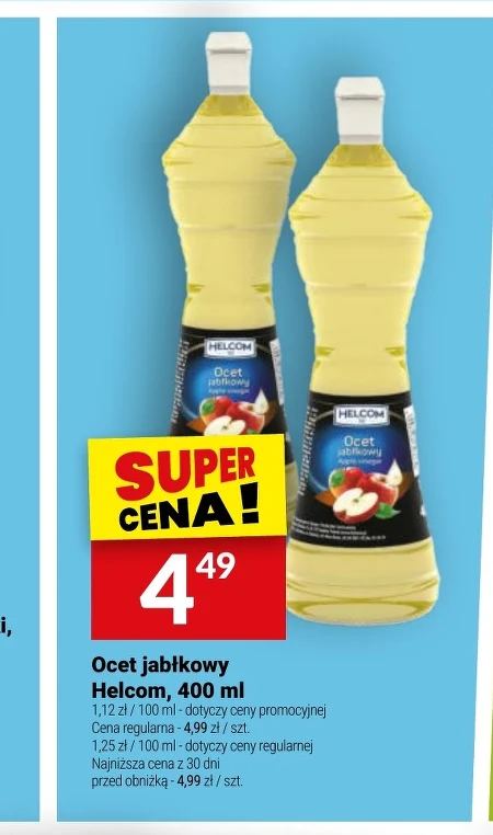 Ocet jabłkowy Helcom w Twoj Market dostępny jest w cenie 4,49 zł za butelkę o pojemności 400 ml, co daje 1,12 zł za 100 ml. Standardowa cena tego produktu to 4,99 zł, dzięki czemu teraz można go nabyć w obniżonej cenie. Ocet jabłkowy to wszechstronny produkt, który znajduje zastosowanie zarówno w kuchni, jako składnik sałatek i marynat, jak i w gospodarstwie domowym, np. do czyszczenia. Jest to najniższa cena z ostatnich 30 dni, wcześniej oferowany był w cenie 4,99 zł. Warto skorzystać z tej okazji i zaopatrzyć się w ten popularny produkt. Oferta ważna od 2026-04-08 do 2026-04-14 Źródło: gazetka Twoj Market