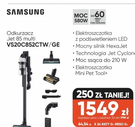 Odkurzacz Jet 85 multi VS20C852CTW/GE MOC 580W do 60 MINUT MAX. CZAS DZIAŁANIA • Elektroszczotka z podświetleniem LED • Mocny silnik HexaJet • Technologia Jet Cyclone • Moc ssąca do 210 W • Elektroszczotka Mini Pet Tool+
