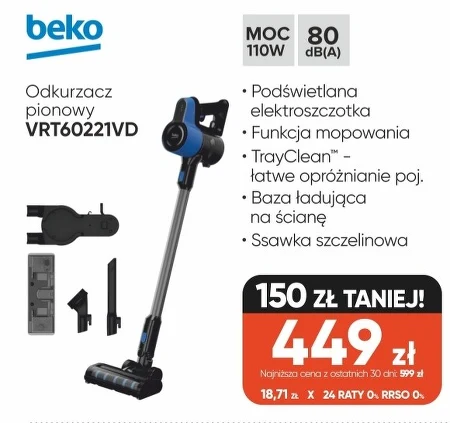 Odkurzacz pionowy VRT60221VD • Podświetlana elektroszczotka • Funkcja mopowania • TrayClean™ - łatwe opróżnianie poj. • Baza ładująca na ścianę • Ssawka szczelinowa