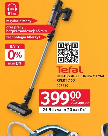 Tefal ODKURZACZ PIONOWY TY6A35 XPERT 7.60 997619 399,00 1 szt. z VAT 490,77 24.54 z VAT x 20 RAT 0%¹ regulacja mocy czas pracy bezprzewodowej: 45 min technologia Allergy+ RATY 0% RRSO 0% Odkurzacz pionowy Tefal XPERT 7.60 (model TY6A35) dostępny jest w Selgros Cash&Carry w cenie 399,00 zł. Urządzenie oferuje 45 minut bezprzewodowej pracy i posiada regulację mocy, a technologia Allergy+ sprawia, że jest idealny do walki z alergenami. Możliwość zakupu na 20 rat 0% z RRSO 0% czyni go atrakcyjną propozycją dla osób poszukujących wydajnego i wygodnego sprzętu do sprzątania.