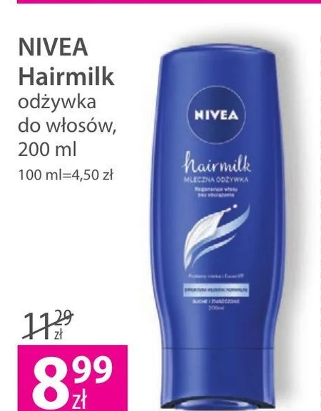 Łagodna odżywka regenerująca NIVEA Hairmilk z proteinami mleka - intensywnie pielęgnuje włosy normalne i grube bez ich obciążania. Włosy zyskują wspaniały wygląd i zupełnie nowe życie. Regeneruje włosy i wzmacnia je od wewnątrz. Składniki zawarte w odżywce wypełniają ubytki w strukturze włosa i dzięki temu chronią Twoje suche i zniszczone włosy przed dalszym zniszczeniem. Dla zapewnienia optymalnego efektu, stosuj razem z łagodnym szamponem pielęgnującym NIVEA Hairmilk do włosów o strukturze normalnej. Dla pięknych włosów i zdrowej skóry głowy.