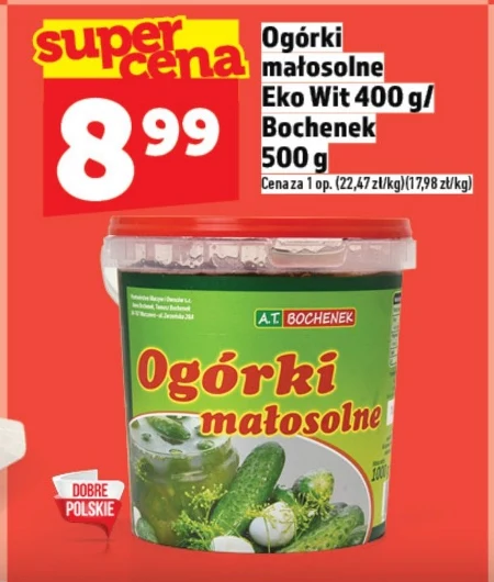 Ogórki małosolne Eko Wit 400 g dostępne są w ofercie Topaz w cenie 8,99 zł, co daje 17,98 zł za kilogram. Te tradycyjnie przygotowane ogórki idealnie sprawdzą się jako dodatek do wielu dań, czy też jako smaczna przekąska. Doskonale komponują się z pieczywem, wędlinami i serami, a także mogą być bazą do przygotowania sałatek. Warto skorzystać z tej okazji, by uzupełnić zapasy tego popularnego przysmaku. Oferta ważna od 2026-04-16 do 2026-04-22 Źródło: gazetka Topaz
