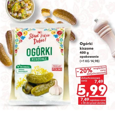 Ogórki kiszone: 400 g. Najniższa cena z 30 dni przed obniżką: 7,49 zł.