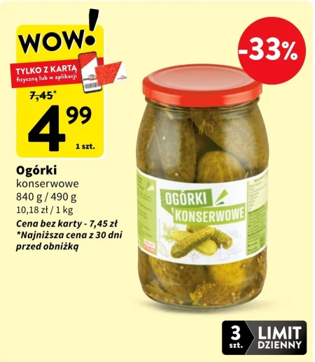 Ogórki konserwowe 840 g / 490 g 10,18 zł / 1 kg Cena bez karty - 7,45 zł Doskonale sprawdzą się jako chrupiąca przekąska prosto z słoika, idealna do kanapek czy sałatek warzywnych. Świetnie komponują się z twarożkiem, jajkami na twardo lub jako dodatek do dań mięsnych, wzbogacając smak potraw o orzeźwiającą nutę. Konserwowe ogórki to także doskonały wybór na piknik czy grill, gdzie docenią je miłośnicy zdrowych i niskokalorycznych przekąsek.