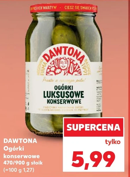 DAWTONA Ogórki konserwowe 470/900 g słoik (=100 g 1,27) Ogórki konserwowe to idealny dodatek do kanapek, sałatek oraz dań obiadowych, nadając im chrupkości i wyjątkowego smaku. Wykorzystaj je jako składnik w domowych hamburgerach lub jako przekąskę do alkoholi podczas spotkań ze znajomymi.