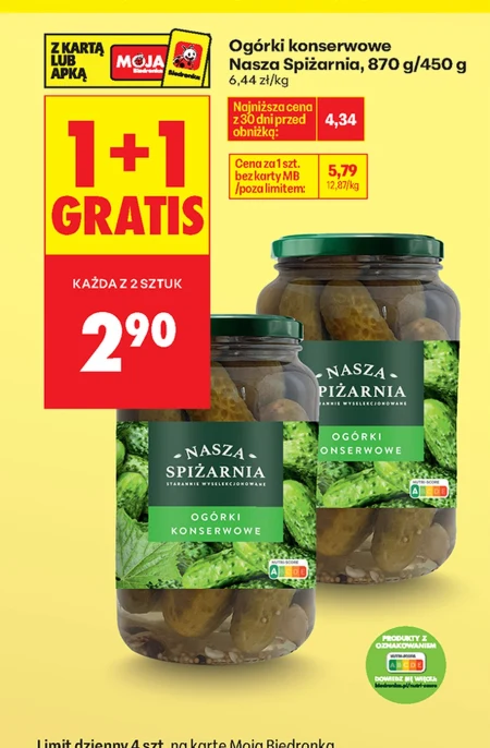 Ogórki konserwowe Nasza Spiżarnia, 870 g/450 g 6,44 zł/kg Najniższa cena z 30 dni przed obniżką: 4,34 Cena za 1 szt. bez karty MB poza limitem: 5,79 12,87/kg