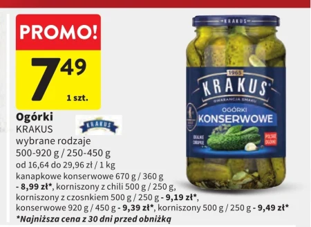 Ogórki KRAKUS KRAKUS wybrane rodzaje 500-920 g / 250-450 g od 16,64 do 29,96 zł / 1 kg kanapkowe konserwowe 670 g / 360 g - 8,99 zł*, korniszony z chili 500 g / 250 g, korniszony z czosnkiem 500 g / 250 g - 9,19 zł*, konserwowe 920 g / 450 g - 9,39 zł*, korniszony 500 g / 250 g - 9,49 zł*