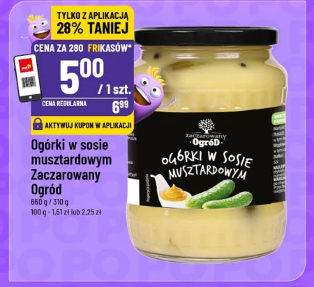 Ogórki w sosie musztardowym Zaczarowany Ogród 660 g / 310 g 100 g – 1,61 zł lub 2,25 zł TYLKO Z APLIKACJĄ 28% TANIEJ CENA ZA 280 FRIKASÓW* 5,00 /1 szt. CENA REGULARNA 6,99 AKTYWUJ KUPON W APLIKACJI Ogórki w sosie musztardowym Zaczarowany Ogród dostępne są w dwóch wagach – 660 g i 310 g, a cena za 100 g wynosi odpowiednio 1,61 zł lub 2,25 zł. W POLOmarket, dzięki aplikacji i aktywacji kuponu, można je kupić 28% taniej, za jedyne 5,00 zł zamiast 6,99 zł, co odpowiada cenie za 280 frikasów. To idealna przekąska lub dodatek do kanapek i sałatek, szczególnie dla miłośników smaków musztardowych.