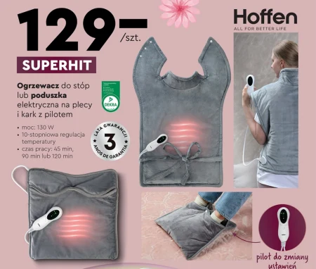 Ogrzewacz do stóp lub poduszka elektryczna na plecy i kark z pilotem • moc: 130 W • 10-stopniowa regulacja temperatury • czas pracy: 45 min, 90 min lub 120 min
