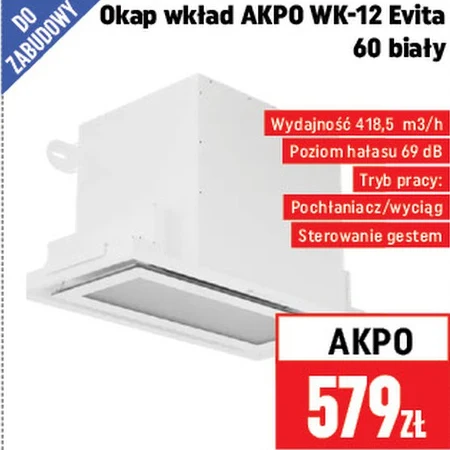 Okap wkład AKPO WK-12 Evita 60 biały dostępny jest w Neopunkt w cenie 579 zł. Ten wydajny okap o wydajności 418,5 m3/h i sterowaniu gestem sprawdzi się w każdej kuchni, skutecznie usuwając nieprzyjemne zapachy podczas gotowania. Urządzenie pracuje w trybie pochłaniacza lub wyciągu, a jego poziom hałasu wynosi 69 dB.
