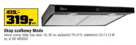 Okap szafkowy Modo kolory czamy, biały, inox, wym: 50, 60 cm, wydajność 174 m³/h, oświetlenie LED 2 x 1,5 W.